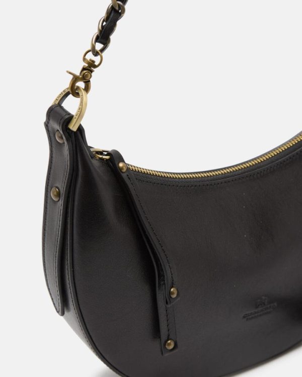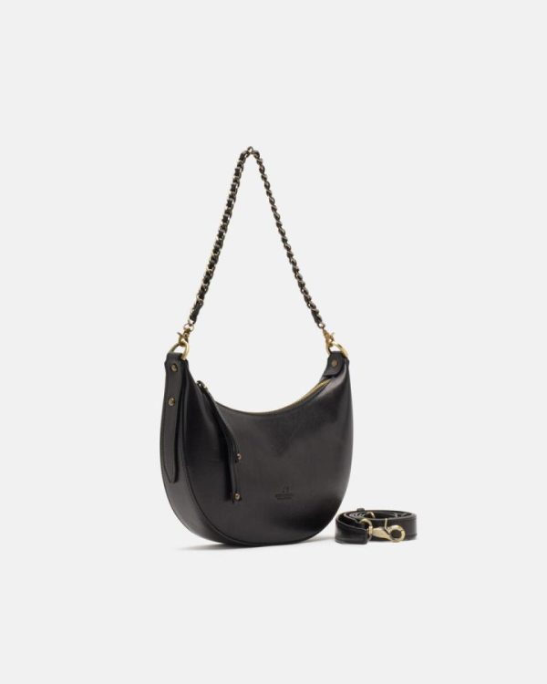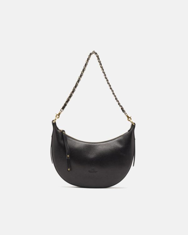 The ideal bag for those who want the moon! The small hobo Eva, with its delightful half-moon shape, can become intriguing and cheerful when used with the chain and extremely comfortable when used with the adjustable shoulder strap. The small but ample space inside makes her the perfect friend on shopping days in the city centre and the perfect character for more institutional dinners. An explosion of style.