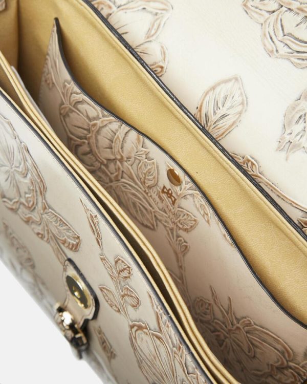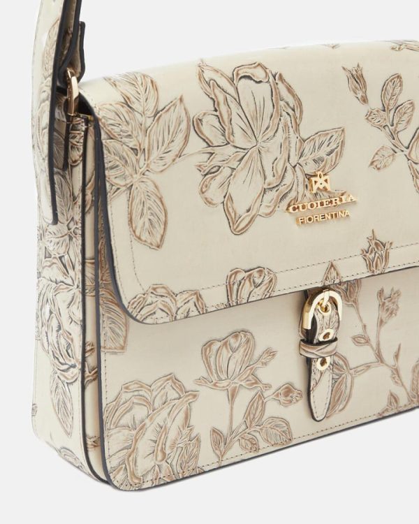 Mimi represents a true style icon and represents a worldwide exclusive of the brand. The peculiarity is contained in the long articulated process consisting of over 13 processing steps of the floral motif. Not only calfskin, but a true artwork, expertly hand-painted on different levels. The end result is a unique material of its kind, with which small masterpieces are made.