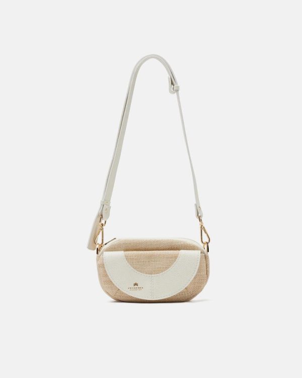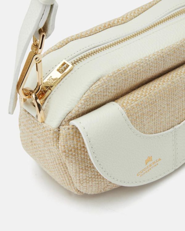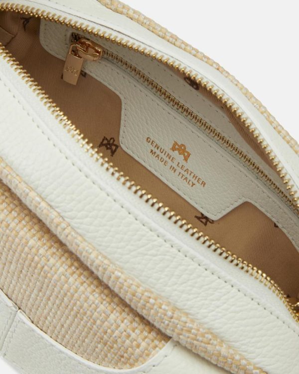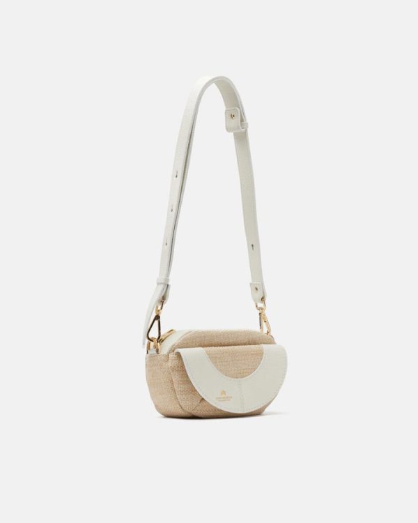 Jacquard fabric made from a mix of cotton, linen and raffia, with a consistent and rich weave in neutral colours, for everyday wear. The details are made of full-grain leather.