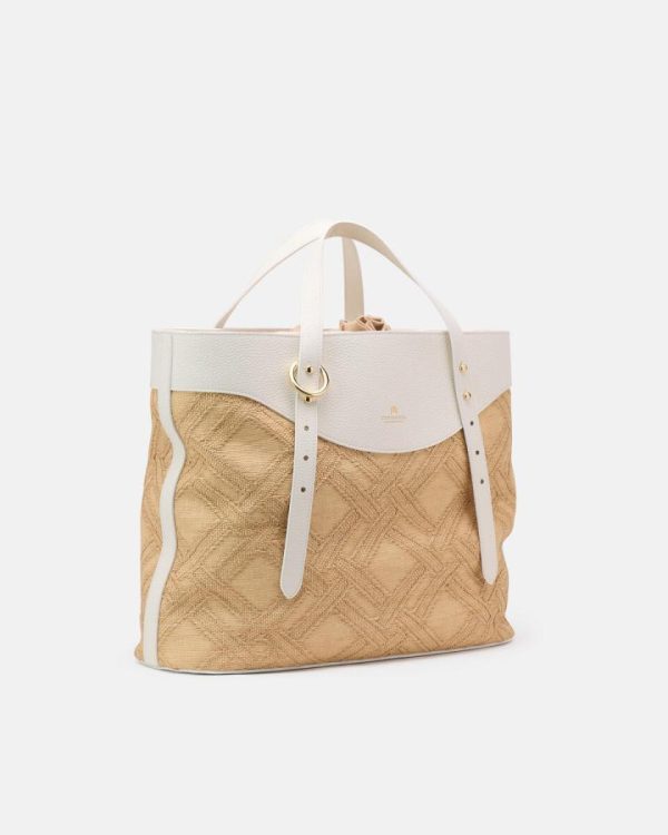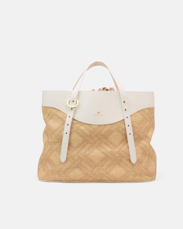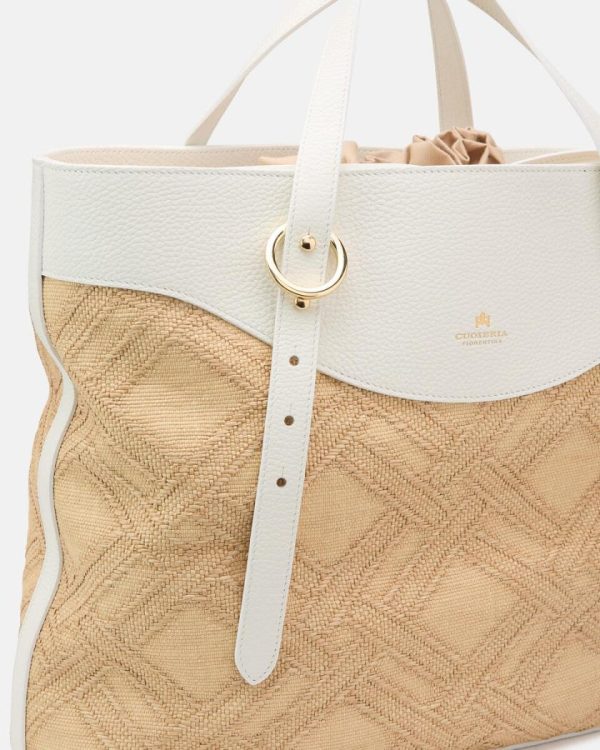 Refined natural-effect rafia with contrasting central detail in soft first-grain calfskin.