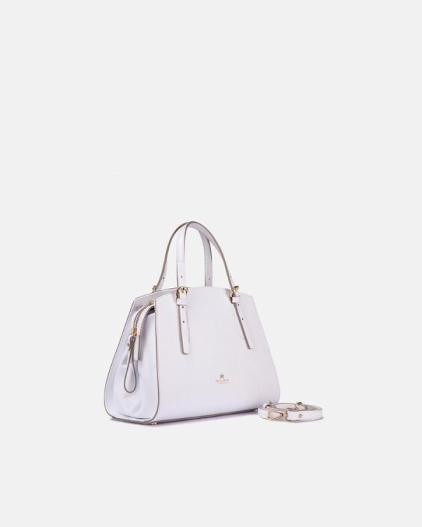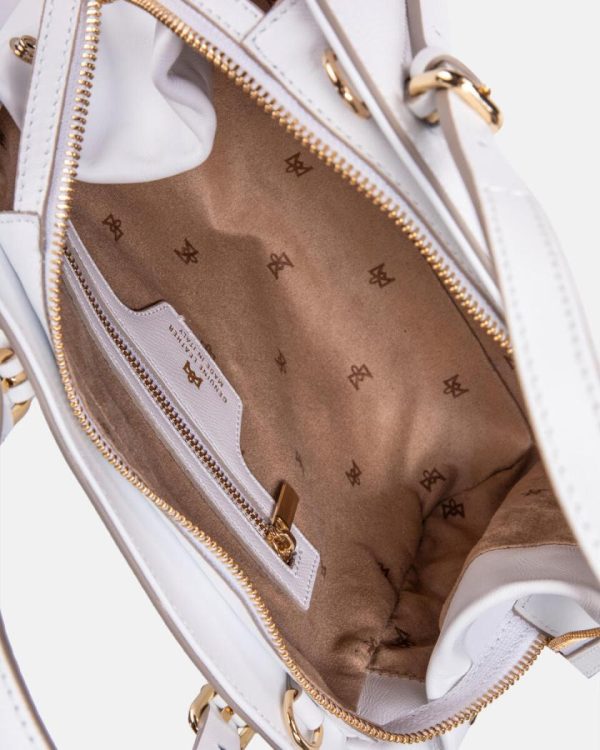 Refined and minimal, this small Alice tote bag in palmellato leather combines lightness and top quality materials with a slightly retro design that makes it formal and precious. It has a double handle, an adjustable and removable shoulder strap, golden metal details, studs on the bottom and embossed logo. The lined spacious interior has a rear pocket for documents and is ideal for storing your smartphone, camera, wallet and other personal effects. Perfect for formal events, it adds a chic touch to even the most casual look. Finely manufactured in Italy.